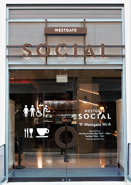 The Works: Stylish signage was required for this food hall at Westgate shopping centre. Internal and external signage was required constructed from worn copper with subtle back lit illumination. Contrasting faux neon was also installed to a curve glass façade.